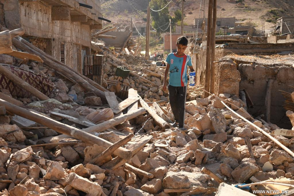 أمزميز 11 سبتمبر 2023 (شينخوا) في الصورة الملتقطة يوم 10 سبتمبر 2023، طفل يسير وسط الأنقاض بالقرب من مركز زلزال الحوز بمدينة أمزميز بالمغرب.