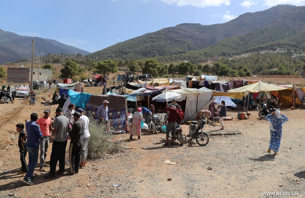 أمزميز 11 سبتمبر 2023 (شينخوا) في الصورة الملتقطة يوم 10 سبتمبر 2023، سكان يتخذون مأوى في ساحة مفتوحة بالقرب من مركز زلزال الحوز في مدينة أمزميز بالمغرب.