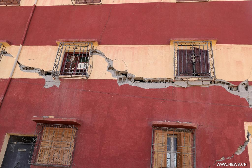 أمزميز 11 سبتمبر 2023 (شينخوا) في الصورة الملتقطة يوم 10 سبتمبر 2023، مبانٍ متضررة بالقرب من مركز زلزال الحوز بمدينة أمزميز بالمغرب.