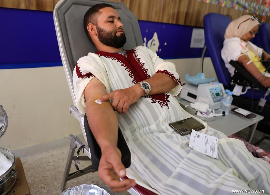 مراكش 12 سبتمبر 2023 (شينخوا) في الصورة الملتقطة يوم 12 سبتمبر 2023، مواطنون يتبرعون بالدم في مركز للتبرع بالدم في مراكش بالمغرب لمساعدة ضحايا الزلزال المدمر الذي ضرب البلاد.