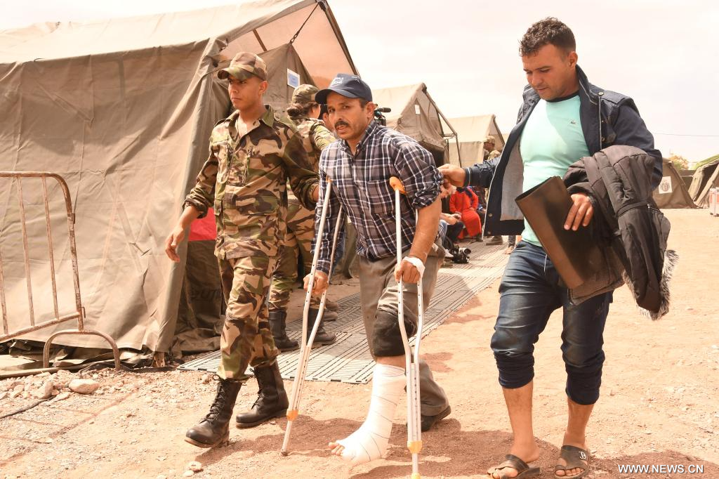 الحوز 12 سبتمبر 2023 (شينخوا) في الصورة الملتقطة يوم 12 سبتمبر 2023، أحد المصابين إلى جانب مستشفى مؤقت في إقليم الحوز أقيم خصيصا لعلاج ضحايا الزلزال المدمر الذي ضرب المغرب.