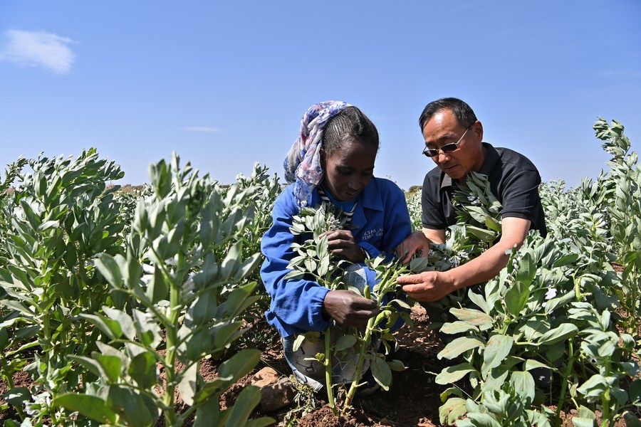 خبير المحاصيل البقولية ليو يون مين (يمين) يقوم بتثقيف مزارعة محلية حول الإدارة الحقلية للفاصوليا العريضة في بستان نموذجي تابع للمساعدة التقنية الزراعية في أسمرة بإريتريا في 27 سبتمبر 2023. (شينخوا)