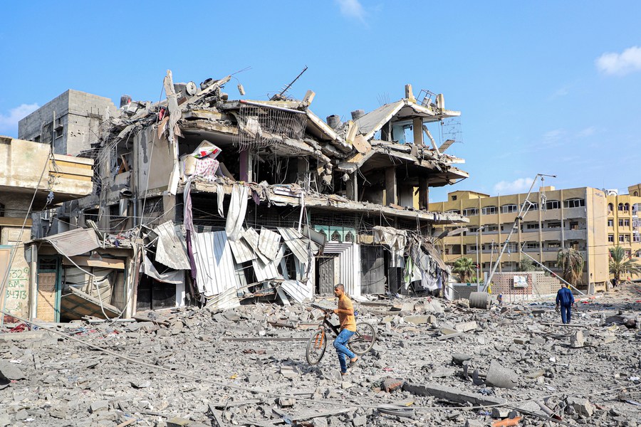 أشخاص يسيرون أمام مبان مدمرة في أعقاب غارة جوية إسرائيلية على مدينة غزة في 10 أكتوبر 2023. (شينخوا)