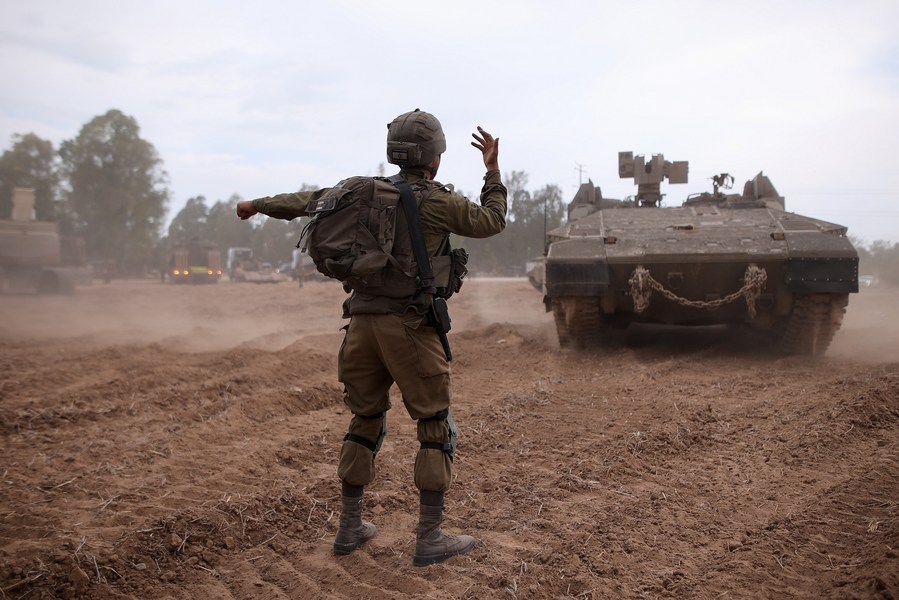 تظهر هذه الصورة الملتقطة في 9 أكتوبر 2023 دبابة إسرائيلية على الحدود بين إسرائيل وغزة. (شينخوا)