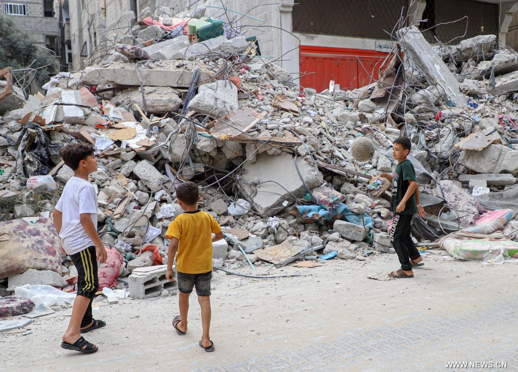 غزة 28 أكتوبر 2023 (شينخوا) في الصورة الملتقطة يوم 27 أكتوبر 2023، أطفال فلسطينيون يلعبون كرة القدم بجانب أنقاض مبنى بمدينة خان يونس جنوبي قطاع غزة.