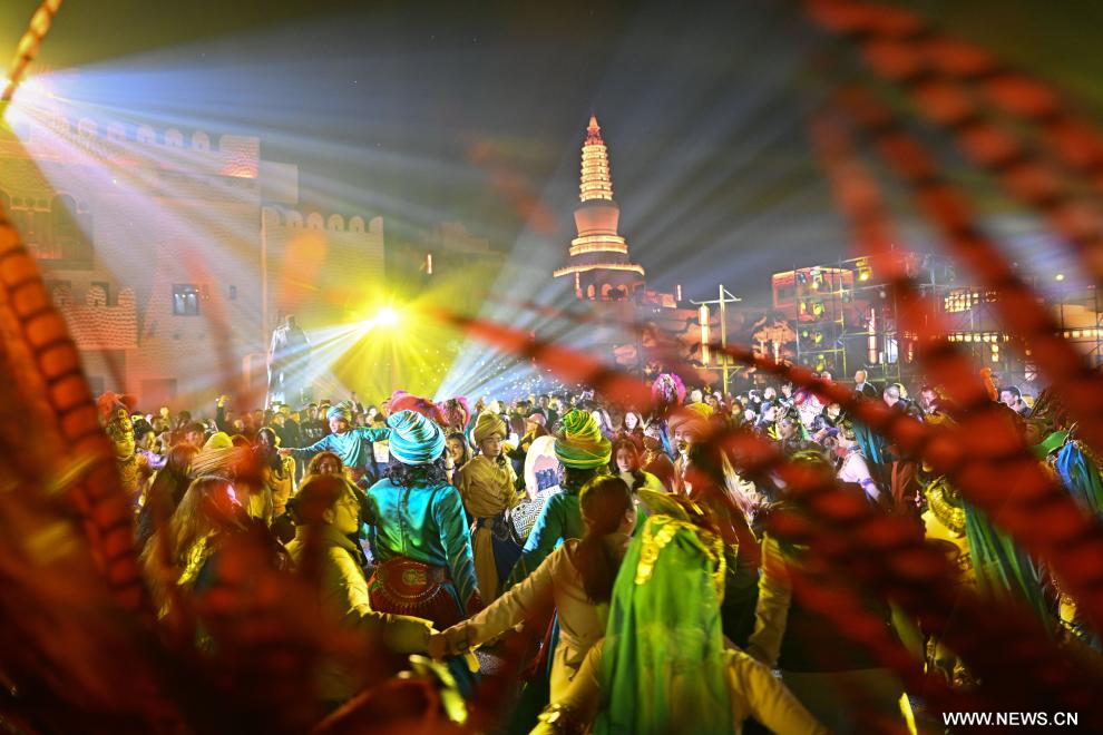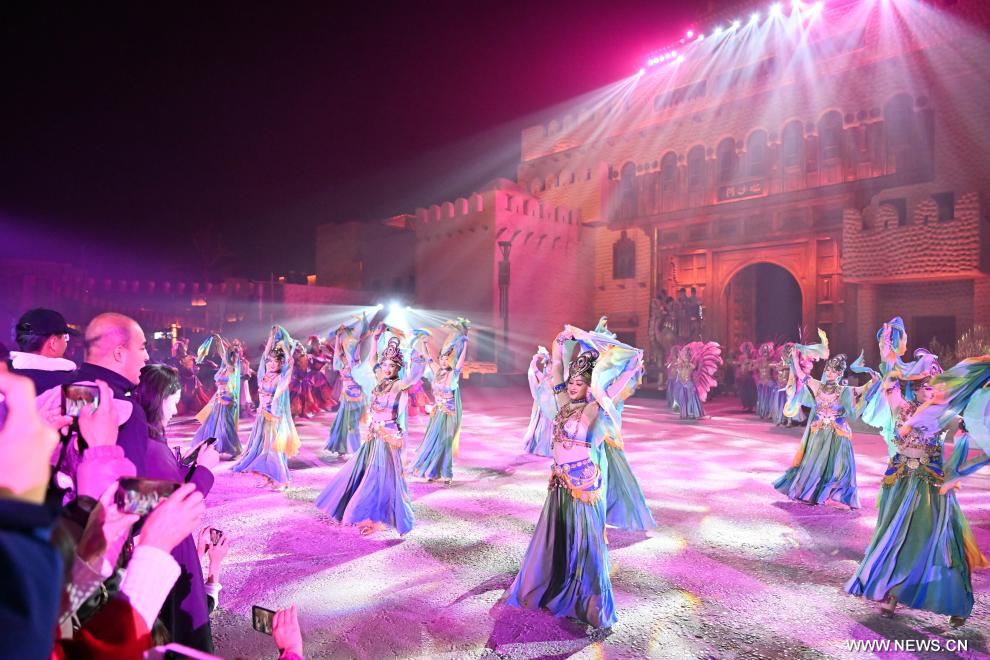 خوتان 10 نوفمبر 2023 (شينخوا) في الصورة الملتقطة يوم 7 نوفمبر 2023، فنانون يؤدون عروضاً في منطقة يوتكان الثقافية ذات المناظر الخلابة في محافظة خوتان بمنطقة شينجيانغ الويغورية ذاتية الحكم في شمال غربي الصين.