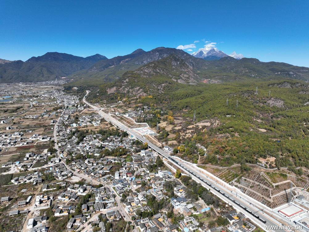 ديتشينغ 26 نوفمبر 2023 (شينخوا) في الصورة الملتقطة جواً يوم 25 نوفمبر 2023، مشهد لجزء من خط سكة حديد ليجيانغ-شانغريلا في مدينة ليجيانغ بمقاطعة يوننان في جنوب غربي الصين. ويفتتح اليوم الأحد أمام حركة المرور خط سكة حديد ليجيانغ-شانغريلا، الذي يربط بين ليجيانغ وشانغريلا في المقاطعة.
