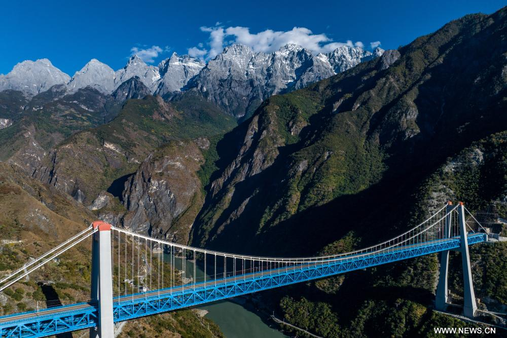 ديتشينغ 26 نوفمبر 2023 (شينخوا) في الصورة الملتقطة جوا يوم 25 نوفمبر 2023، مشهد لجسر نهر جينشا الكبير ضمن خط سكة حديد ليجيانغ-شانغريلا في مقاطعة يوننان بجنوب غربي الصين. ويفتتح اليوم الأحد أمام حركة المرور خط سكة حديد ليجيانغ-شانغريلا، الذي يربط بين ليجيانغ وشانغريلا في المقاطعة.