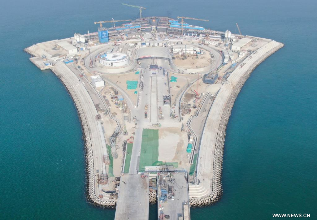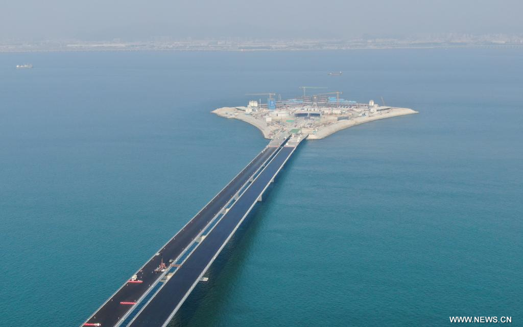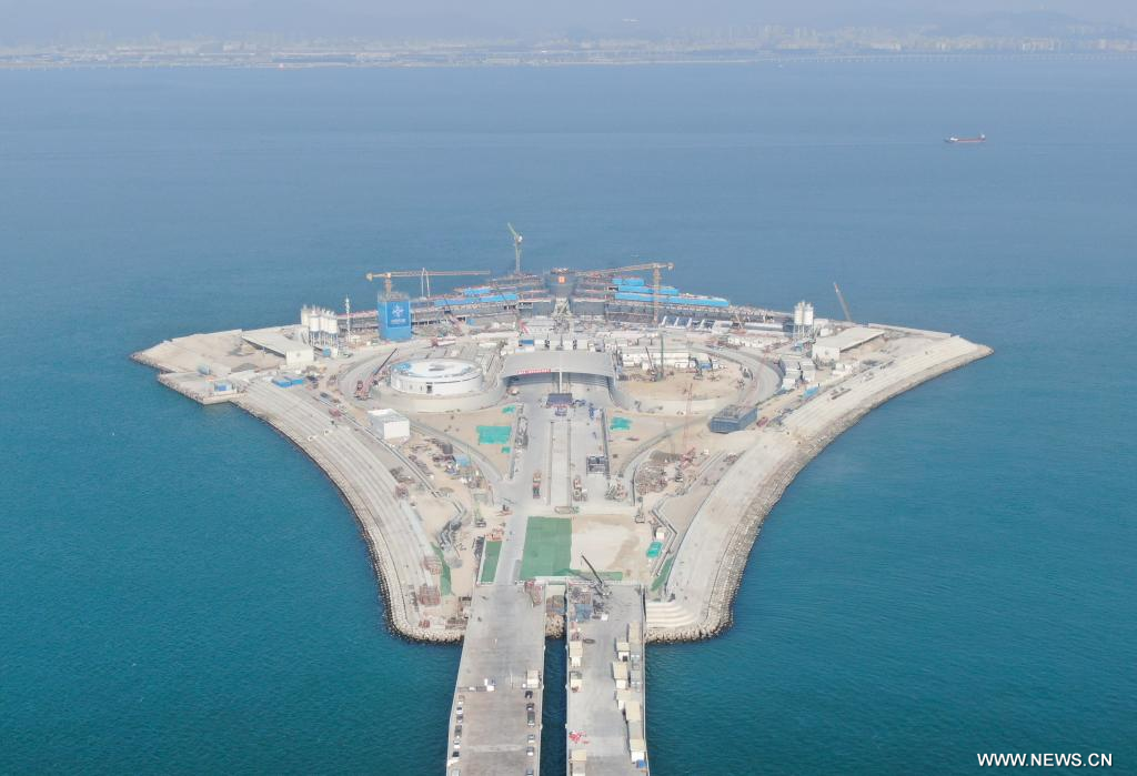 في الصورة الجوية الملتقطة يوم 27 نوفمبر 2023، الجزيرة الاصطناعية الغربية لوصلة شنتشن-تشونغشان في مقاطعة قوانغدونغ جنوبي الصين. اقترب اكتمال تشييد مشروع طريق سريع عبر البحر بين مدينتي شنتشن وتشونغشان في مقاطعة قوانغدونغ جنوبي الصين.