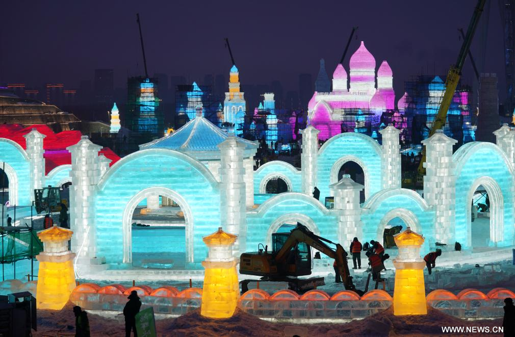 هاربين 15 ديسمبر 2023 (شينخوا) في الصورة الملتقطة يوم 12 ديسمبر 2023، موقع بناء لعالم هاربين للجليد والثلج، وهو منتزه ترفيهي موسمي شهير يفتح كل شتاء، في مدينة هاربين بمقاطعة هيلونغجيانغ بشمال شرقي الصين. وسيفتتح المنتزه المذكور موسمه الشتوي الـ25 في 18 ديسمبر الجاري، حيث من المتوقع أنه يتم استخدام 250 ألف متر مكعب من الجليد والثلج في بنائه.