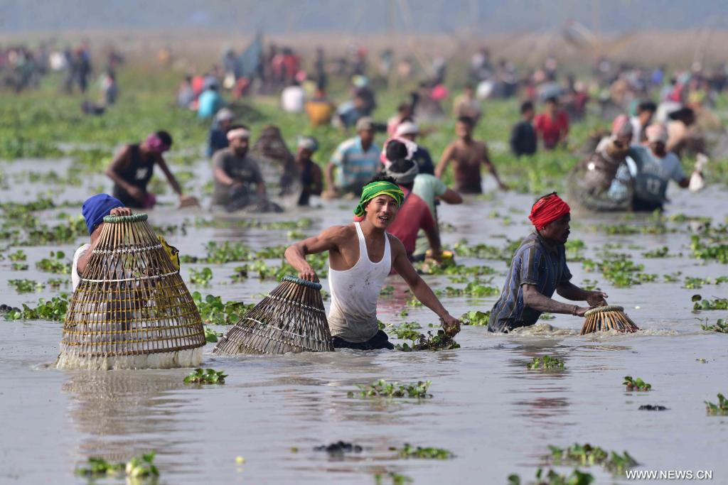 آسام 15 يناير 2024 (شينخوا) في الصورة الملتقطة يوم 14 يناير 2024، أشخاص يشاركون في فعالية مجتمعية لصيد الأسماك بمناسبة احتفال الحصاد في ناحية ناجاون بولاية آسام شمال شرقي الهند.