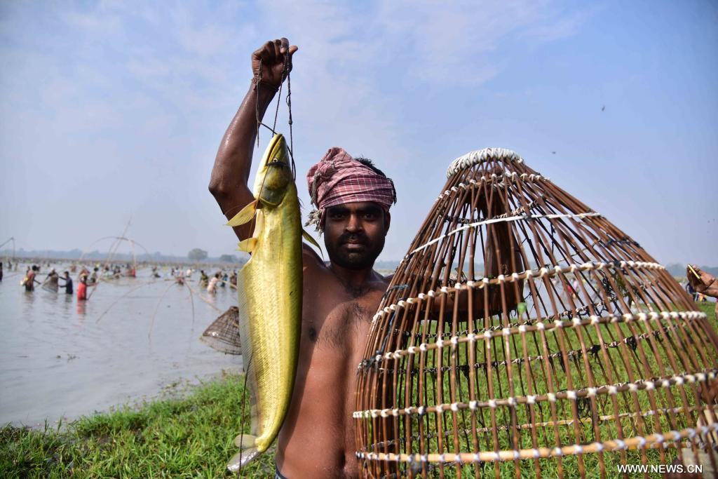 آسام 15 يناير 2024 (شينخوا) في الصورة الملتقطة يوم 14 يناير 2024، رجل يعرض سمكة اصطادها أثناء مشاركته في فعالية مجتمعية لصيد الأسماك بمناسبة احتفال الحصاد في ناحية ناجاون بولاية آسام شمال شرقي الهند.