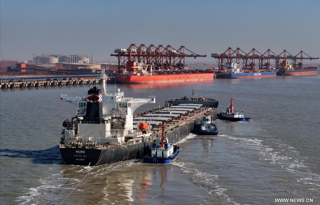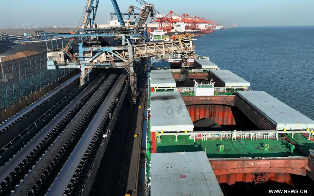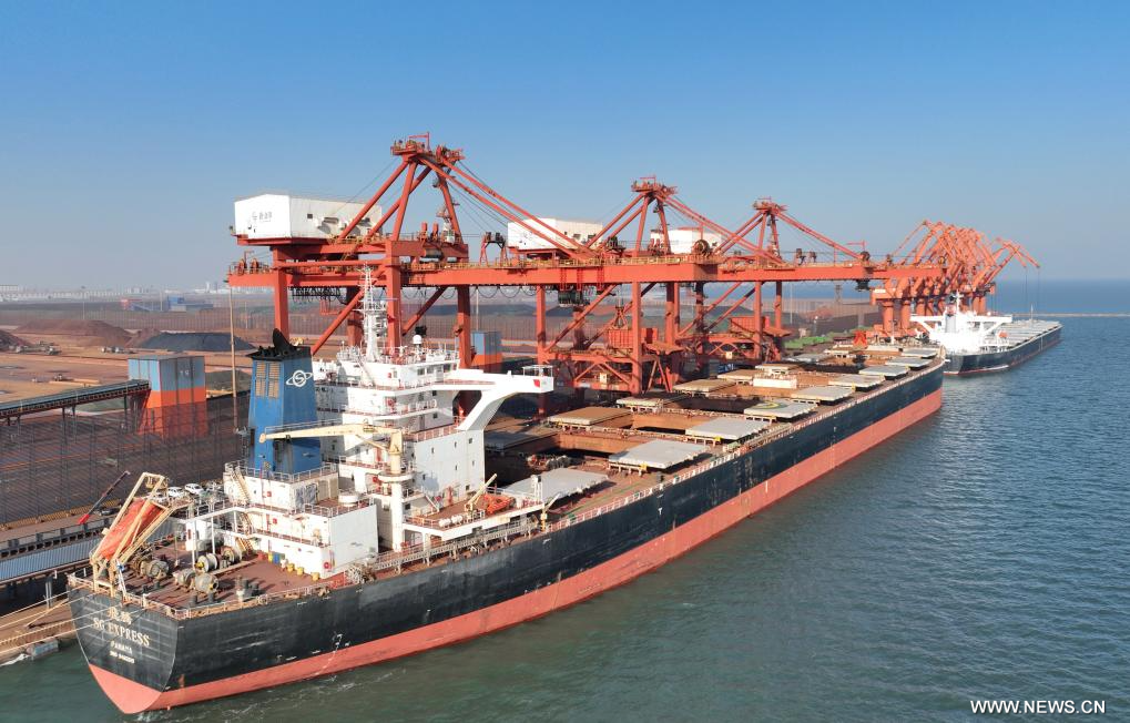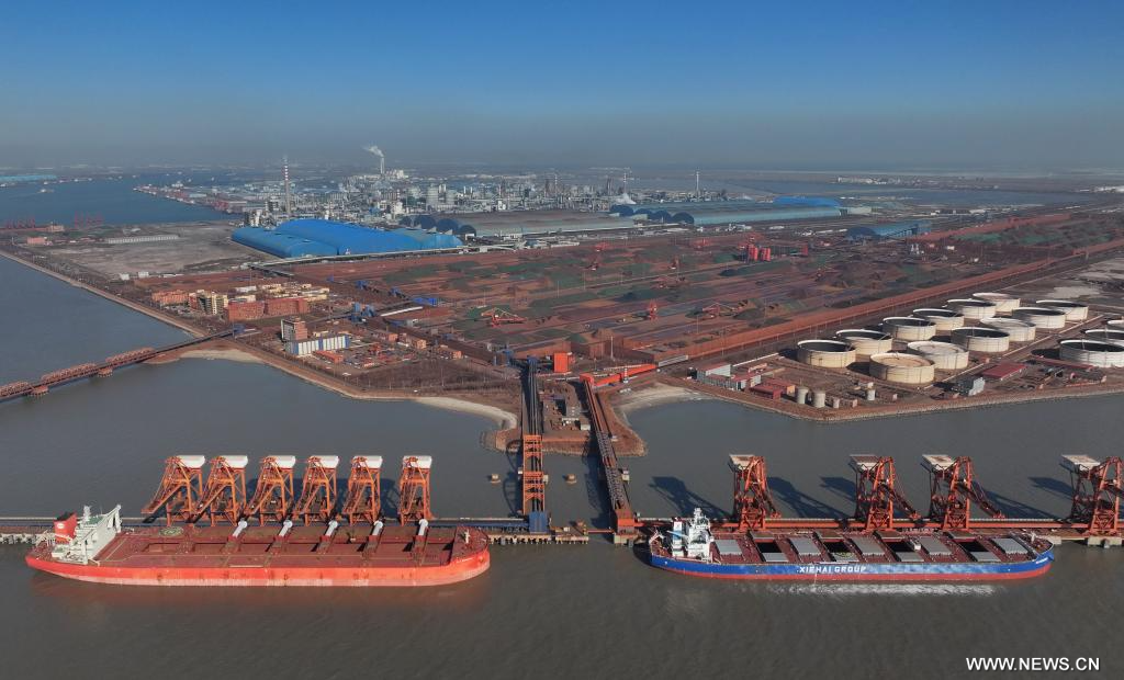 شيجياتشوانغ 29 يناير 2024 (شينخوا) في الصورة الملتقطة يوم 26 يناير 2024، جانب من رصيف المعادن الخام في منطقة تساوفيديان المينائية بميناء تانغشان في مقاطعة خبي بشمالي الصين، حيث سجلت المقاطعة مستوى عالياً جديداً بـ1.36 مليار طن من حجم شحن وتفريغ البضائع عام 2023.