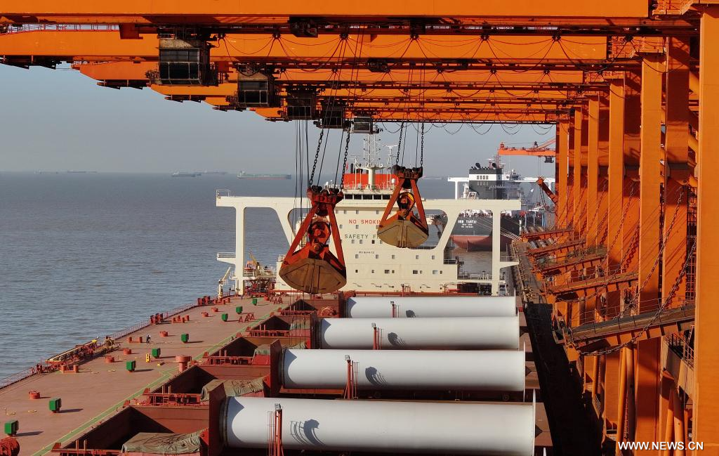 شيجياتشوانغ 29 يناير 2024 (شينخوا) في الصورة الملتقطة يوم 28 يناير 2024، جانب من رصيف المعادن الخام في منطقة تساوفيديان المينائية بميناء تانغشان في مقاطعة خبي بشمالي الصين، حيث سجلت المقاطعة مستوى عالياً جديداً بـ1.36 مليار طن من حجم شحن وتفريغ البضائع عام 2023.
