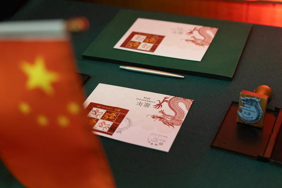 هذه الصورة الملتقطة في الأول من فبراير 2024 تظهر مغلفات تحمل شارة اليوم الأول مع طوابع بمناسبة العام القمري الصيني الجديد القادم، عام التنين، في حفل إصدار طوابع تذكارية في بودابست بالمجر. (شينخوا)