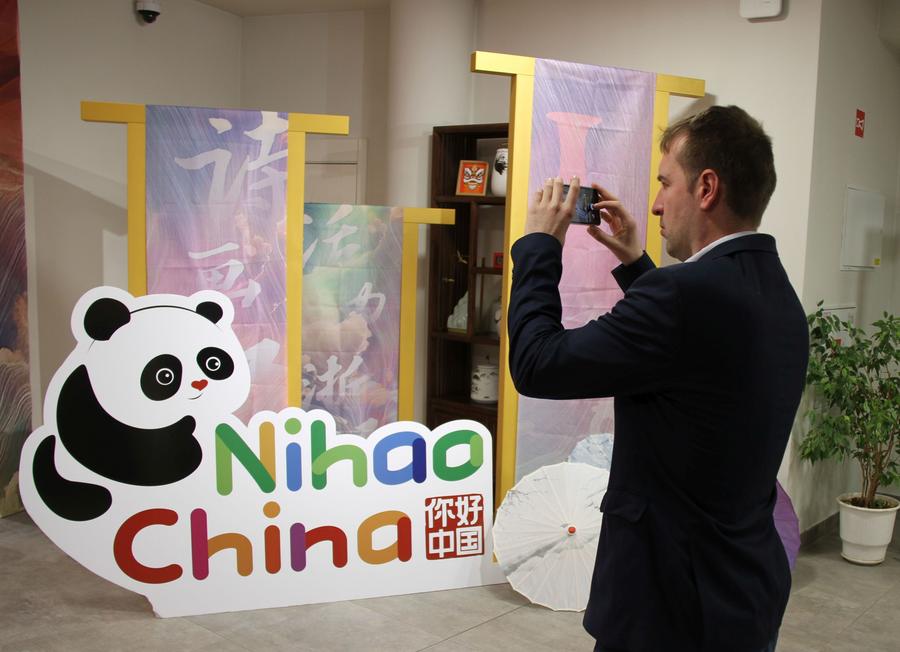 رجل يلتقط صورا لعلامة الحملة السياحية الوطنية للصين "نيهاو تشاينا" (مرحبا الصين) في منتدى للترويج للسياحة الثقافية في مقاطعة تشجيانغ الصينية في صوفيا ببلغاريا في 7 ديسمبر 2023. (شينخوا)