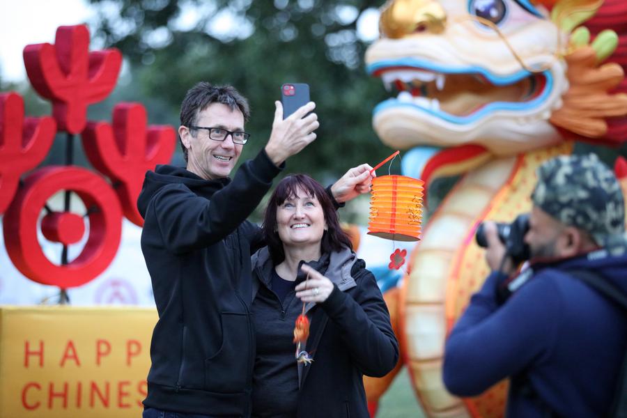 سائحان يلتقطان صورا شخصية (سيلفي) أمام مجسم على شكل تنين تم وضعه للترحيب بالعام القمري الصيني الجديد في منتزه هاغلي بارك في كرايستشيرش بنيوزيلندا في 9 فبراير 2024. (شينخوا)