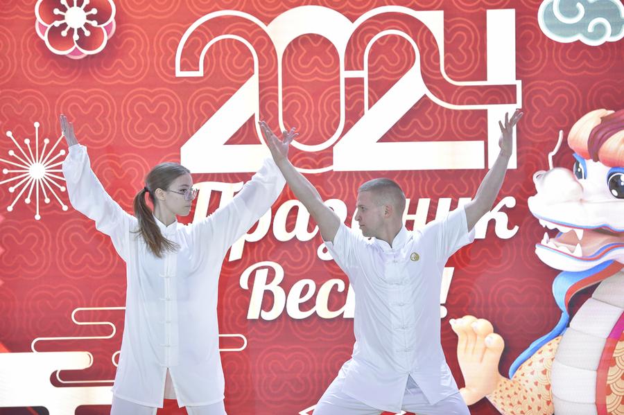 فنانان يقدمان عرضا خلال احتفال أقيم بمناسبة العام القمري الصيني الجديد، أو عيد الربيع، في موسكو بروسيا في 9 فبراير 2024. (شينخوا)