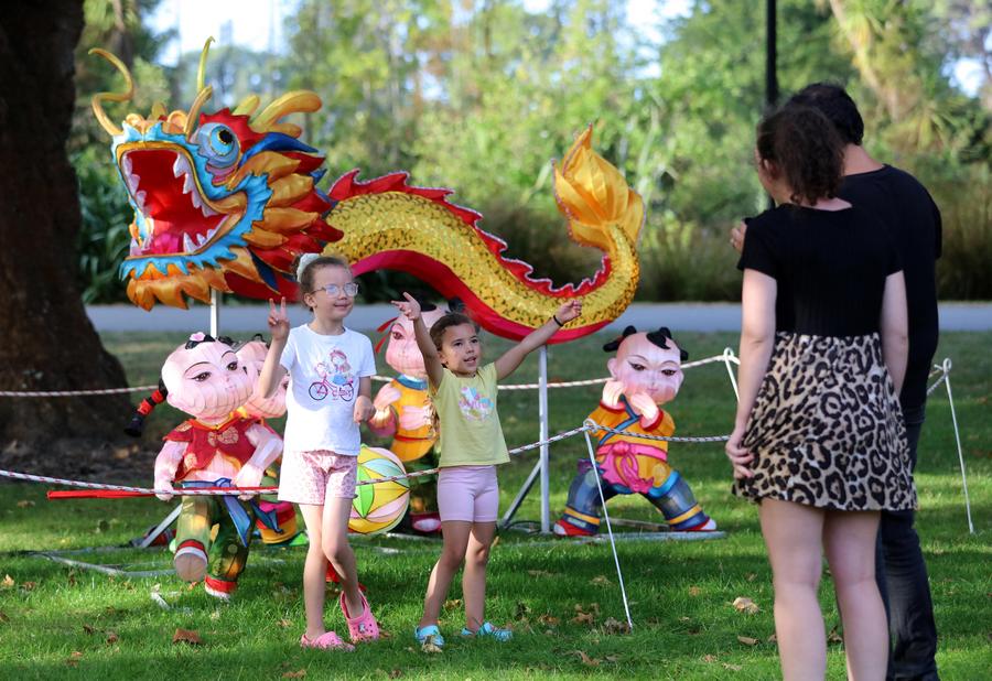 أطفال يقفون لالتقاط الصور أمام مجسم على شكل تنين تم وضعه للترحيب بالعام القمري الصيني الجديد في منتزه هاغلي بارك في كرايستشيرش بنيوزيلندا في 9 فبراير 2024. (شينخوا)