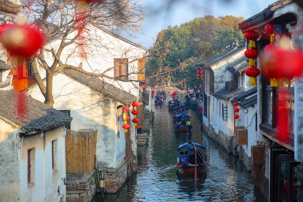 بكين 15 فبراير 2024 (شينخوا) في الصورة الملتقطة يوم 14 فبراير 2024، سياح يزورون بلدة تشوتشوانغ القديمة في كونشان بمقاطعة جيانغسو في شرقي الصين. ويستمتع الناس في جميع أنحاء الصين بعطلة عيد الربيع الجارية بطرق مختلفة.