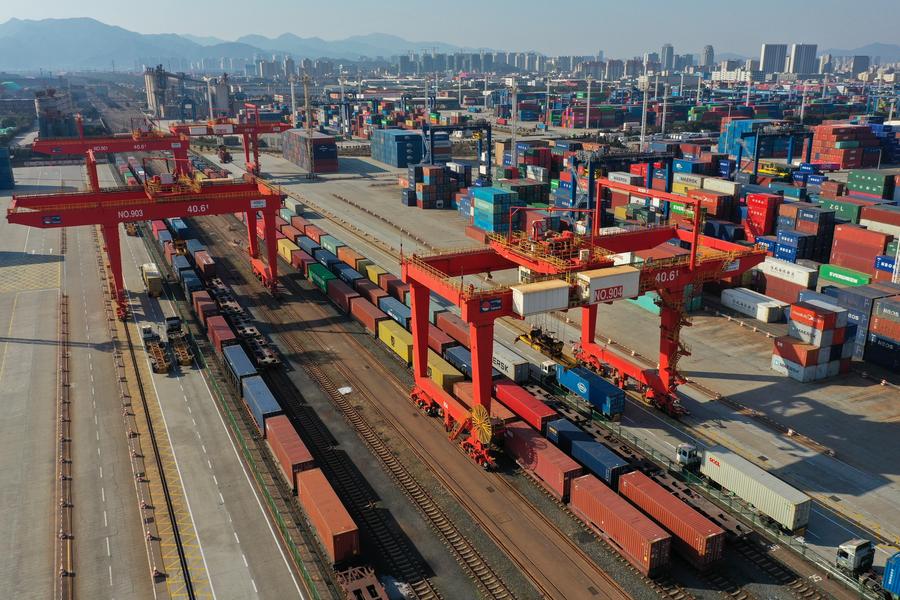 لقطة جوية ملتقطة يوم 24 يناير 2024 تظهر رافعات وقطارات متعددة الوسائط للسكك الحديدية البحرية في محطة سكة حديد ميناء بيلون بميناء نينغبو-تشوشان في مقاطعة تشجيانغ بشرقي الصين. (شينخوا)