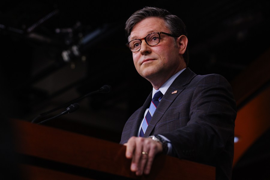 رئيس مجلس النواب الأمريكي مايك جونسون يتحدث في مؤتمر صحفي في مبنى الكابيتول قبل التصويت على عزل وزير الأمن الداخلي أليخاندرو مايوركاس في واشنطن العاصمة، الولايات المتحدة يوم 6 فبراير 2024. (شينخوا)