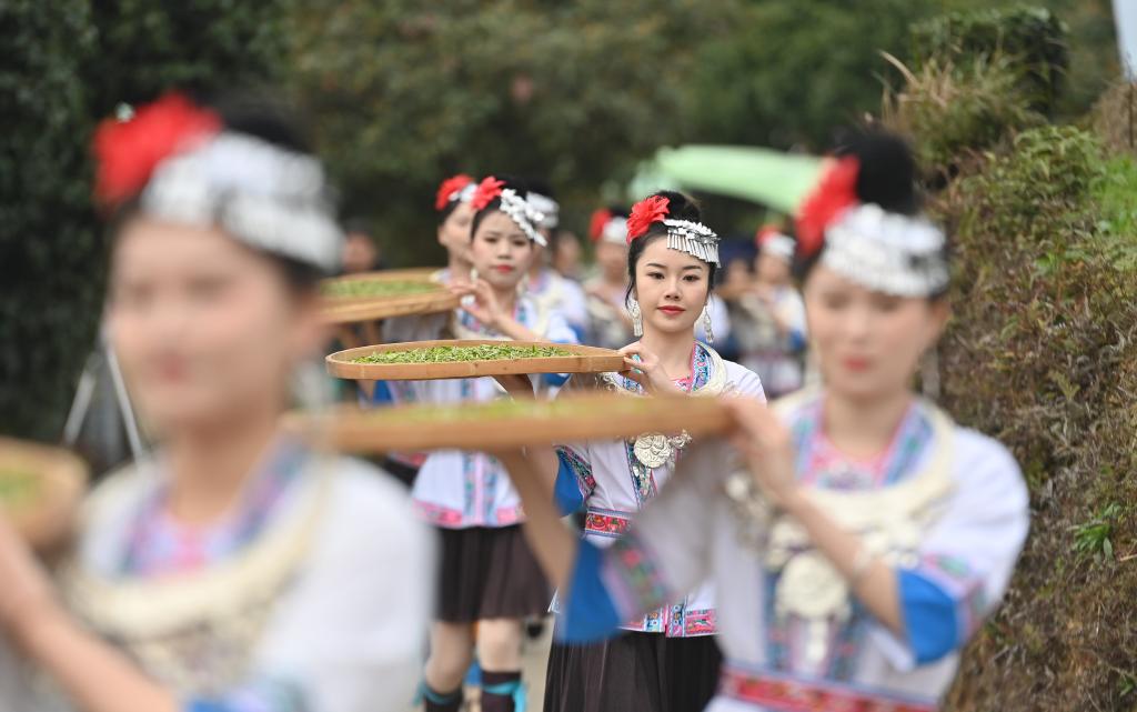 ليوتشو 16 مارس 2024 (شينخوا) في الصورة الملتقطة يوم 14 مارس 2024، فتيات من قومية دونغ يعرضن أوراق الشاي المقطوفة حديثاً في قرية بويانغ ببلدة باجيانغ في محافظة سانجيانغ ذاتية الحكم لقومية دونغ بمنطقة قوانغشي ذاتية الحكم لقومية تشوانغ بجنوبي الصين.