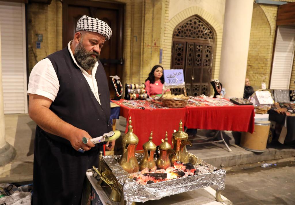 بغداد 23 مارس 2024 (شينخوا) في الصورة الملتقطة يوم 21 مارس 2024، رجل يبيع القهوة العربية التقليدية خلال شهر رمضان في العاصمة العراقية بغداد.