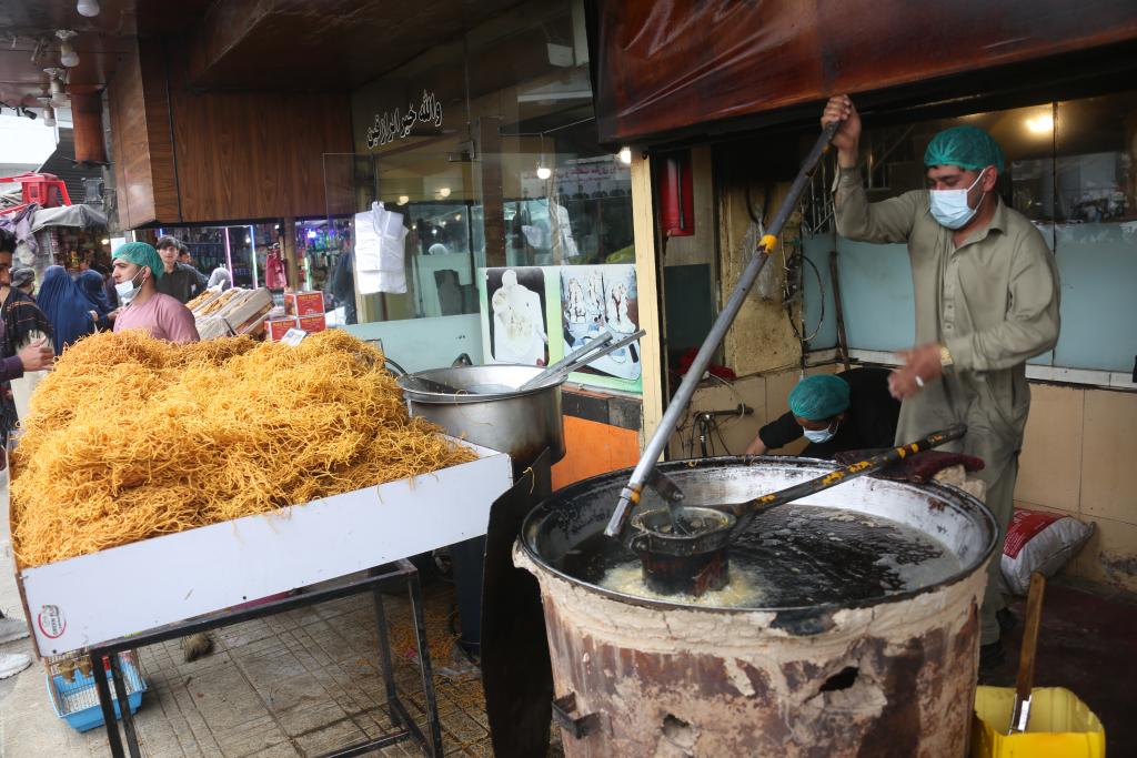 كابول 26 مارس 2024 (شينخوا) في الصورة الملتقطة يوم 26 مارس 2024، بائع يحضر الطعام التقليدي في سوق خلال شهر رمضان في كابول، عاصمة أفغانستان.