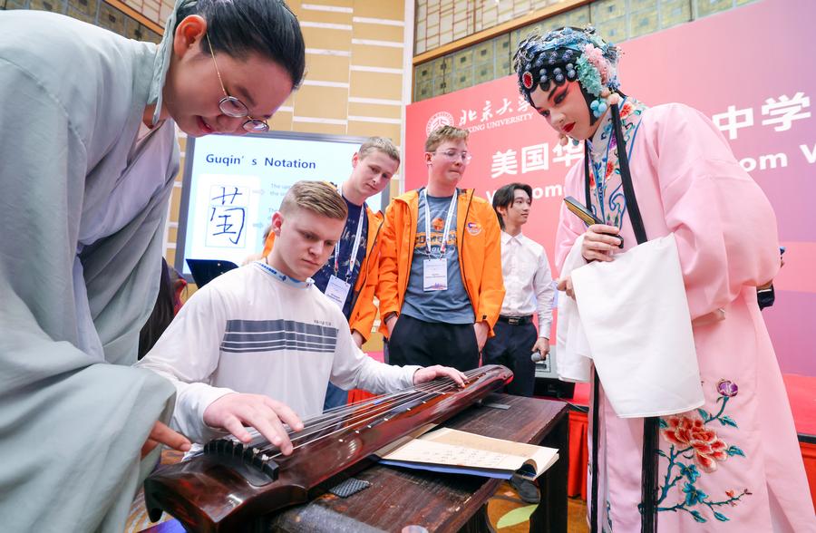 طلاب صينيون يعلمون عضوا بوفد من طلاب المدارس الثانوية من ولاية واشنطن الأمريكية كيفية العزف على آلة "قوتشنغ" الموسيقية الصينية الكلاسيكية، في جامعة بكين بالعاصمة الصينية بكين، 20 مارس 2024. (شينخوا)