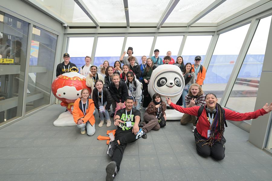 أعضاء وفد من طلاب المدارس الثانوية من ولاية واشنطن الأمريكية يقفون لالتقاط صورة مع بينغ دوين دوين، تميمة الألعاب الأولمبية الشتوية بكين 2022 وشوي رون رون، تميمة الألعاب البارالمبية الشتوية بكين 2022، في مجمع "بيغ إير شوقانغ" بالعاصمة الصينية بكين، 21 مارس 2024. (شينخوا)