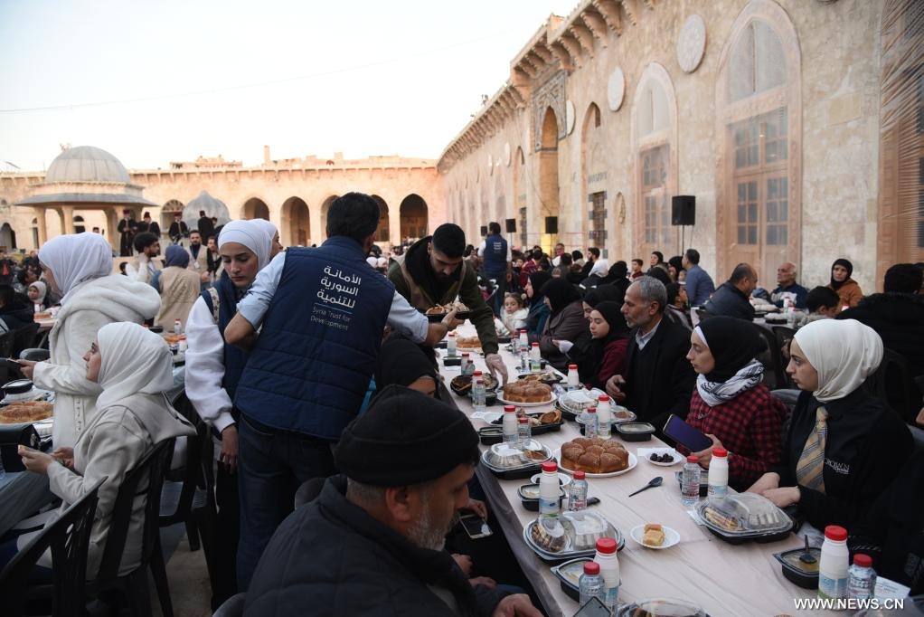 حلب 31 مارس 2024 (شينخوا) في الصورة الملتقطة يوم 30 مارس 2024، أشخاص يحضرون مأدبة إفطار جماعي في جامع حلب الكبير في مدينة حلب السورية، حيث تجمع أكثر من 1200 شخص في الجامع الذي تم ترميمه حديثا من أجل حضور حفل الإفطار الذي نظمته مؤسسات خيرية محلية يوم السبت، إذ يمثل الحفل التجمع الأول من نوعه منذ 12 عاما.