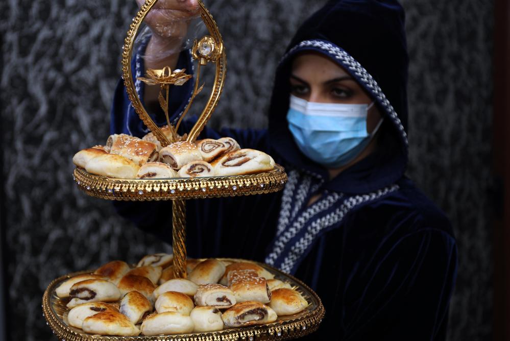 بغداد 9 أبريل 2024 (شينخوا) في الصورة الملتقطة يوم 8 أبريل 2024، فتاة عراقية تعرض الكعك التقليدي المعروف بـ "الكليجا" بمناسبة عيد الفطر في العاصمة العراقية بغداد.