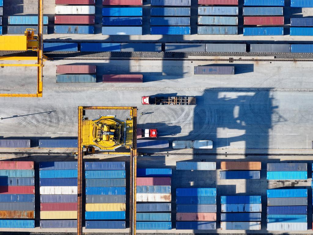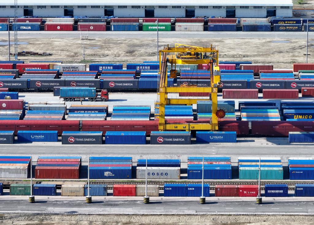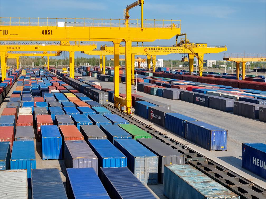 هورجوس 21 أبريل 2024 (شينخوا) في الصورة الملتقطة جوا يوم 18 أبريل 2024، محطة حاويات في ميناء هورجوس للسكك الحديدية بمنطقة شينجيانغ الويغورية ذاتية الحكم بشمال غربي الصين.
