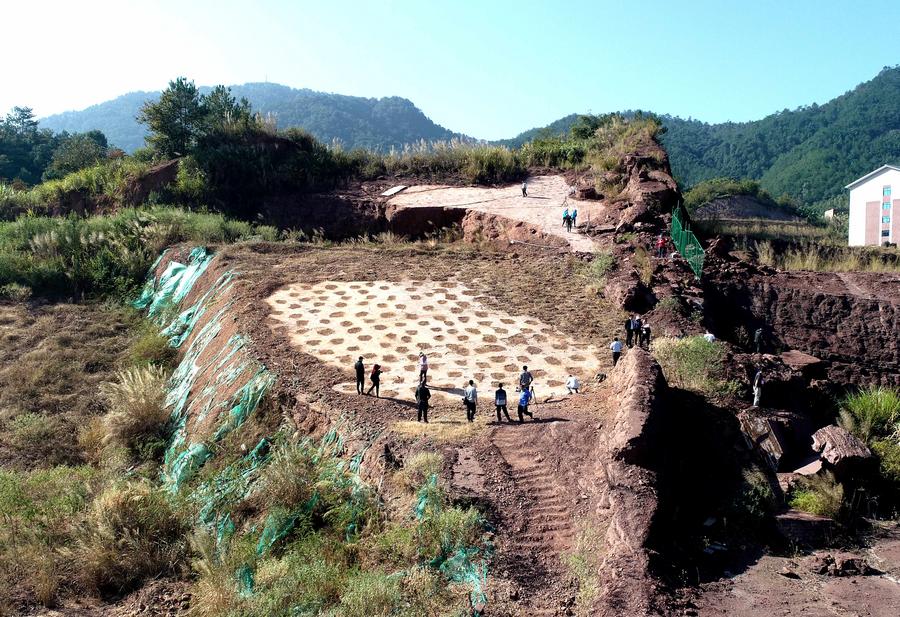 في الصورة الملتقطة جوا يوم 10 نوفمبر 2020، مشهد لموقع لآثار أقدام الديناصورات في بلدة لينتشنغ بمقاطعة فوجيان في جنوب شرقي الصين. (شينخوا)