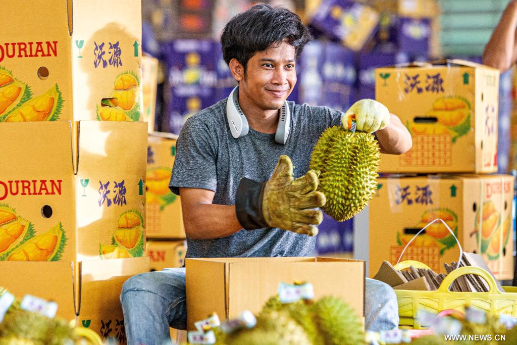 تشانثابوري 13 مايو 2024 (شينخوا) في الصورة الملتقطة يوم 26 أبريل 2024، عامل يعبئ ثمار الدوريان في مصنع تجهيز في تشانثابوري، تايلاند. تعد تايلاند واحدة من أكبر منتجي ومصدري ثمار الدوريان في العالم، حيث تصدر كميات كبيرة إلى الصين كل عام.