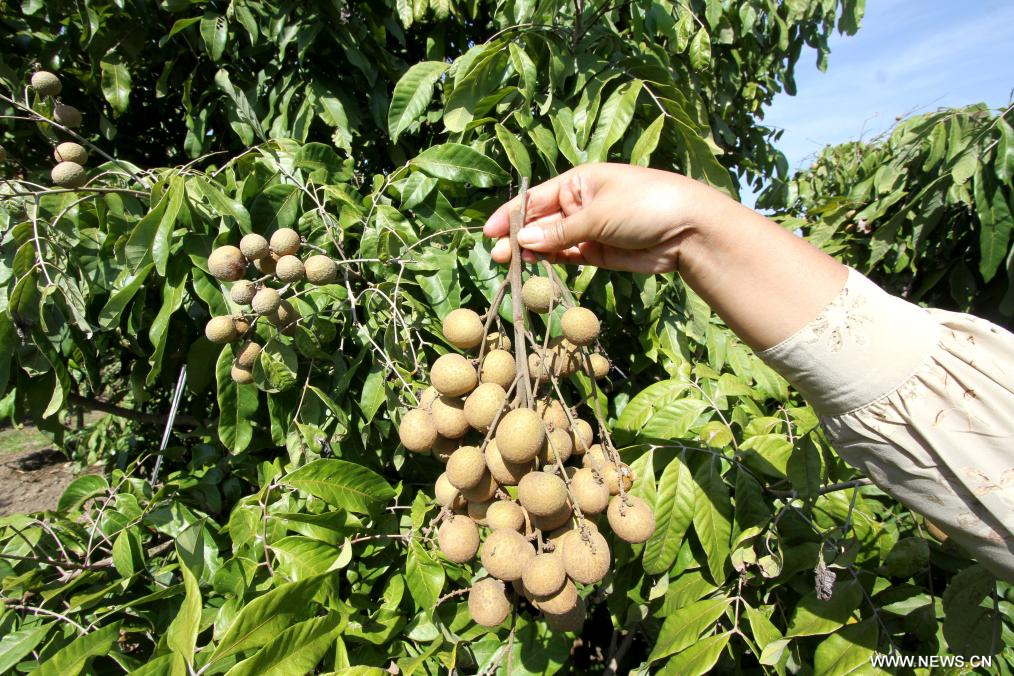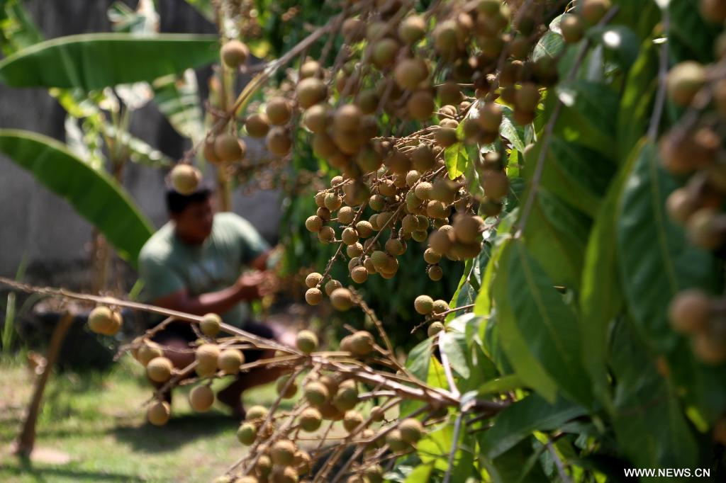 سوكوهارجو 19 مايو 2024 (شينخوا) في الصورة الملتقطة يوم 19 مايو 2024، قروي يحصد فاكهة اللونجان في قرية ترياجان بحي سوكوهارجو في مقاطعة جاوة الوسطى بإندونيسيا.