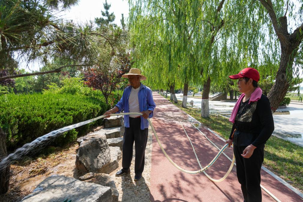 جينان 29 مايو 2024 (شينخوا) في الصورة الملتقطة يوم 28 مايو 2024، موظفان يسقيان النباتات في الممر الإيكولوجي في منطقة النهر الأصفر المنظرية في مدينة جينان حاضرة مقاطعة شاندونغ شرقي الصين. وتمت زراعة 3.23 مليون شجرة في قطاع للنهر الأصفر في مقاطعة شاندونغ شرقي الصين منذ عام 2020، ما يساهم في تحسين البيئة االإيكولوجية على طول النهر الأصفر والمعروف بالنهر الأم للصين.