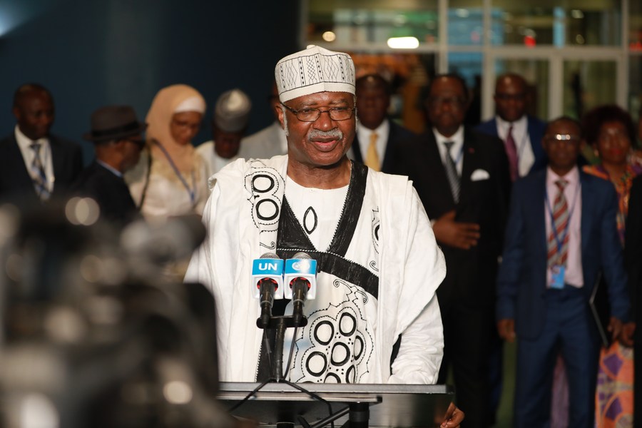 رئيس وزراء الكاميرون السابق فيليمون يانغ يتحدث إلى الصحافة بعد انتخابه رئيسا للدورة الـ79 للجمعية العامة للأمم المتحدة في مقر الأمم المتحدة بنيويورك، في 6 يونيو 2024. (شينخوا)