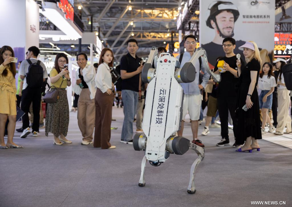 شانغهاي 5 يوليو 2024 (شينخوا) في الصورة الملتقطة يوم 4 يوليو 2024، زوار يشاهدون عرض كلب روبوتي خلال مؤتمر الذكاء الاصطناعي العالمي 2024 في بلدية شانغهاي بشرقي الصين.