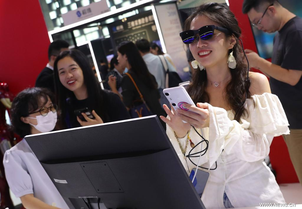 شانغهاي 5 يوليو 2024 (شينخوا) في الصورة الملتقطة يوم 4 يوليو 2024، زائرة تجرب زوج من نظارات الواقع المعزز خلال مؤتمر الذكاء الاصطناعي العالمي 2024 في بلدية شانغهاي بشرقي الصين.