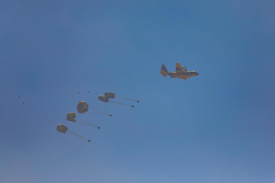 طائرة تقوم بإسقاط مساعدات إنسانية فوق مدينة خان يونس جنوبي قطاع غزة في 8 يوليو 2024. (شينخوا)