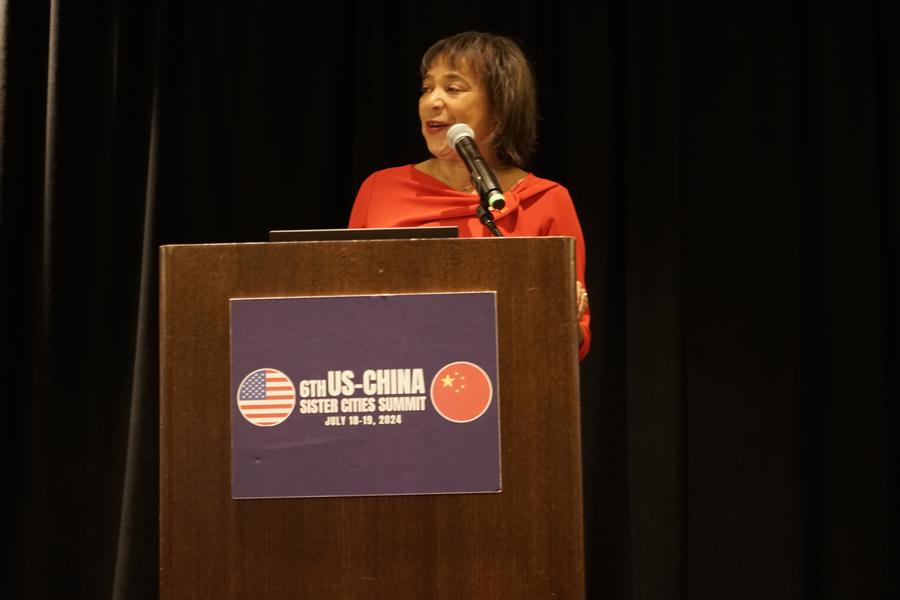 فيكتوريا ووداردز، رئيسة بلدية تاكوما، تُلقي كلمة خلال القمة السادسة للمدن الشقيقة بين الولايات المتحدة والصين في مدينة تاكوما بولاية واشنطن الأمريكية، 19 يوليو 2024. (شينخوا)