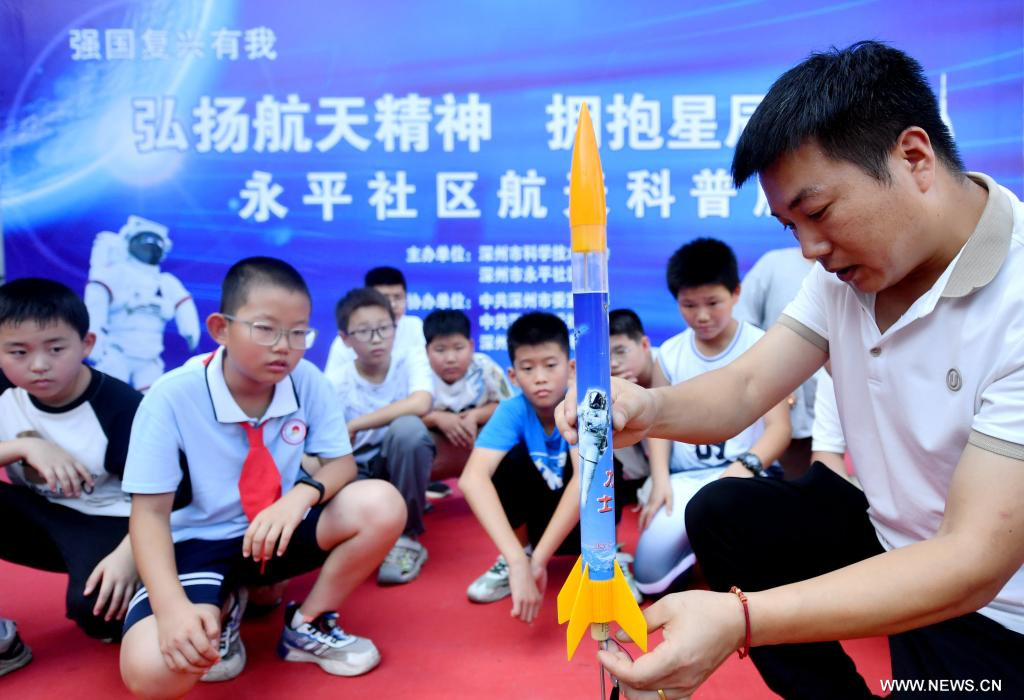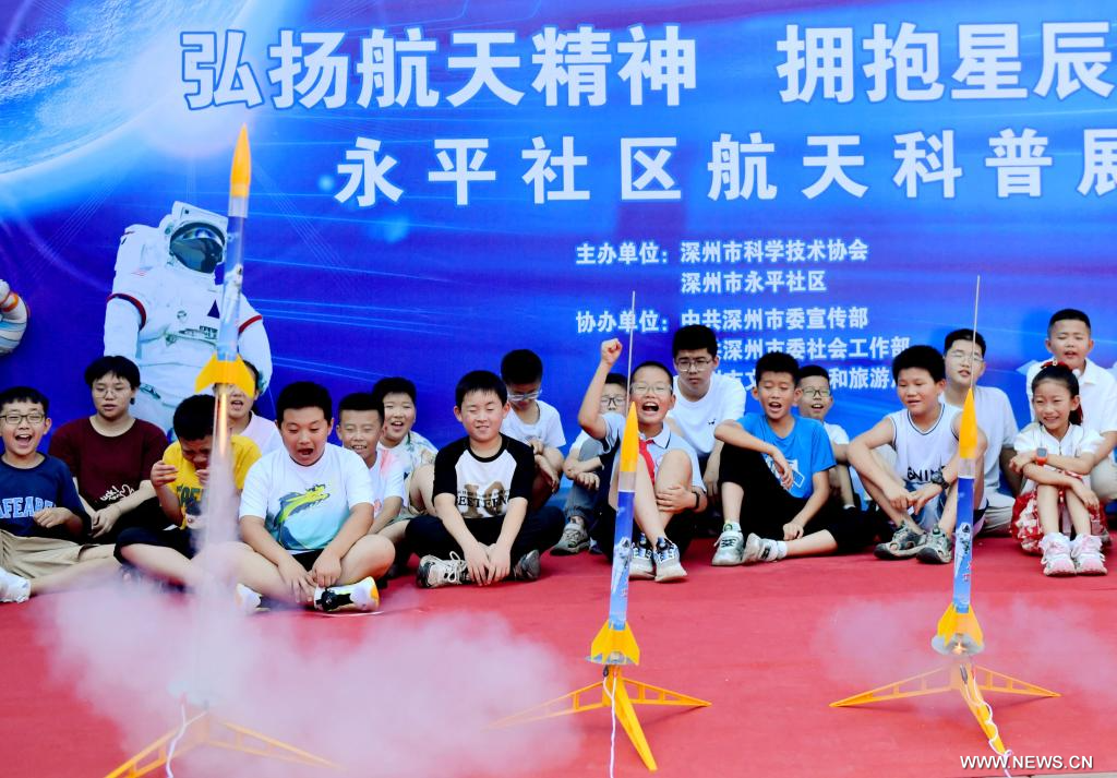 شيجياتشوانغ 20 يوليو 2024 (شينخوا) في الصورة الملتقطة يوم 19 يوليو 2024، أطفال يشاهدون محاكاة لإطلاق نموذج صاروخ في مجتمع يونغبينغ بمدينة شنتشو في مقاطعة خبي بشمالي الصين، وأقام المجتمع فعاليات علمية منوعة لتعميم العلوم والتكنولوجيا بين الأطفال وإغناء حياتهم في العطلة الصيفية.