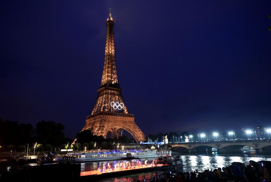 فنانون يؤدون مع برج إيفل في الخلفية خلال حفل افتتاح دورة الألعاب الأولمبية في باريس 2024 في 26 يوليو 2024. (شينخوا)