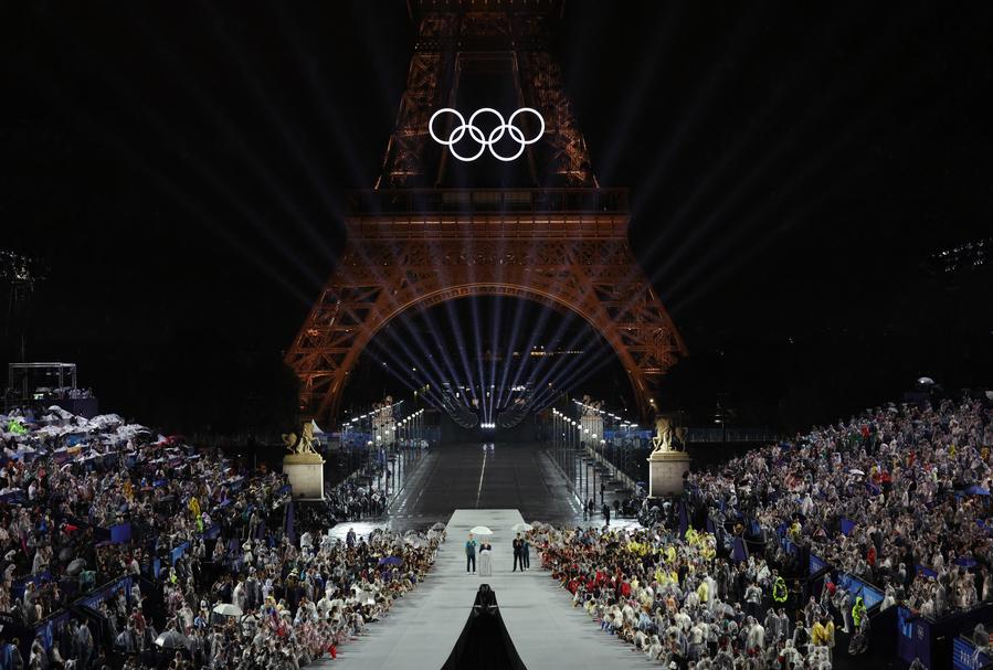 باريس 26 يوليو 2024 (شينخوا) بعد انتظار دام قرنا من الزمان، رحبت باريس بعودة الألعاب الأولمبية بحفل تاريخي تحت المطر على ضفاف نهر السين.