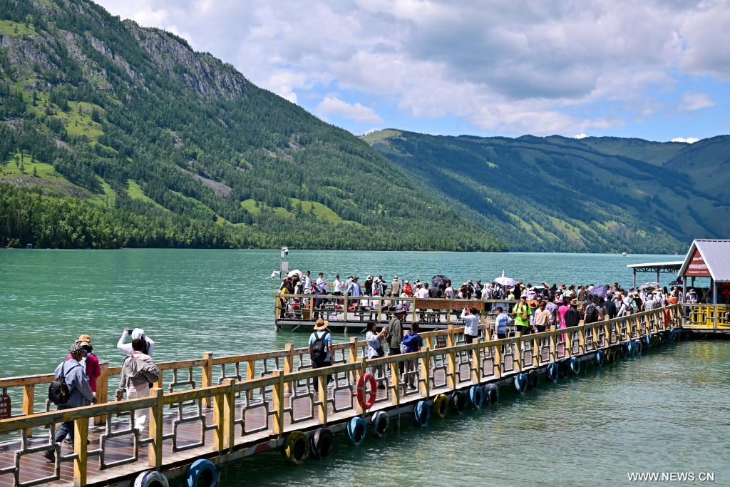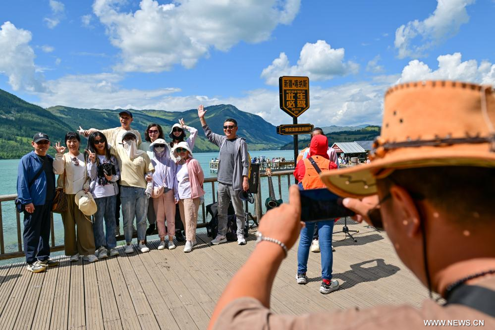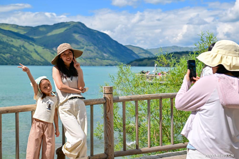 ييلي 30 يوليو 2024 (شينخوا) في الصورة الملتقطة يوم 22 يوليو 2024، سياح يلتقطون صورا في منطقة سياحية بآلتاي في منطقة شينجيانغ الويغورية ذاتية الحكم بشمال غربي الصين، حيث تستقبل المنطقة الغنية بالموارد السياحية المتنوعة عددا وفيرا من السياح مع حلول ذروة الموسم السياحي.