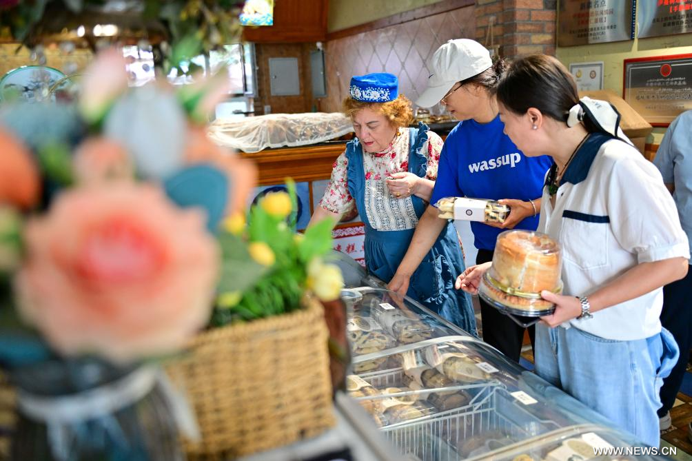 ييلي 30 يوليو 2024 (شينخوا) في الصورة الملتقطة يوم 24 يوليو 2024، السياح يختارون المأكولات التقليدية الشهية بمدينة تاتشنغ في منطقة شينجيانغ الويغورية ذاتية الحكم بشمال غربي الصين، حيث تستقبل المنطقة الغنية بالموارد السياحية المتنوعة عددا وفيرا من السياح مع حلول ذروة الموسم السياحي.