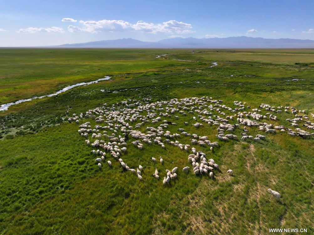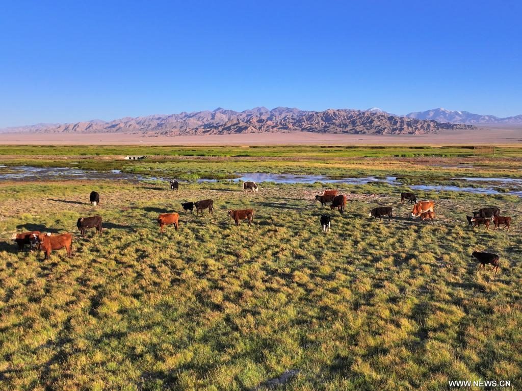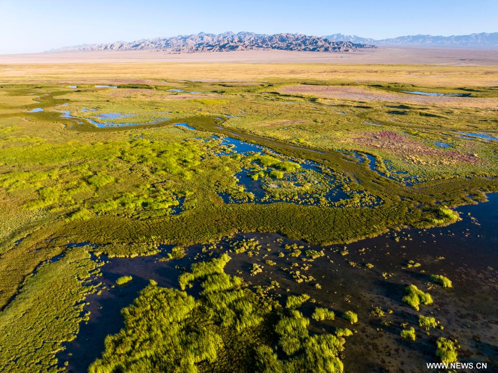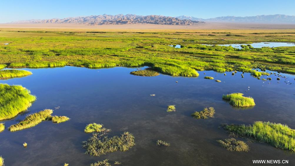 آكساي أول أغسطس 2024 (شينخوا) في الصورة الملتقطة جوا يوم 30 يوليو 2024، منظر طبيعي جميل للأراضي الرطبة ببحيرة سوقان الكبرى في محافظة آكساي الذاتية الحكم لقومية القازاق بمقاطعة قانسو في شمال غربي الصين.