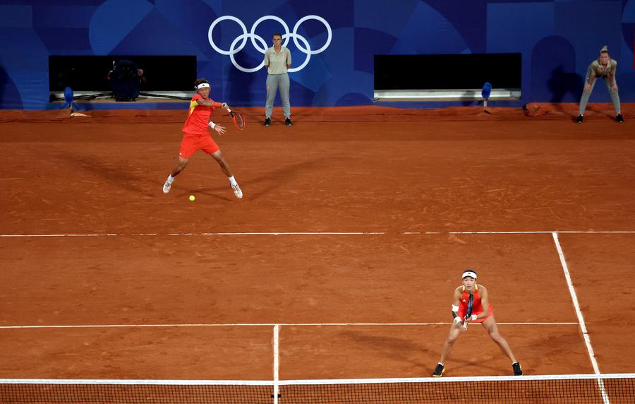 الصينيتان وانغ شين يويه (يمين) وتشانغ تشى تشن تتفاعلان خلال مباراة الميدالية الذهبية لمسابقة تنس الزوجي المختلط في أولمبياد باريس في 2 أغسطس 2024. (شينخوا)